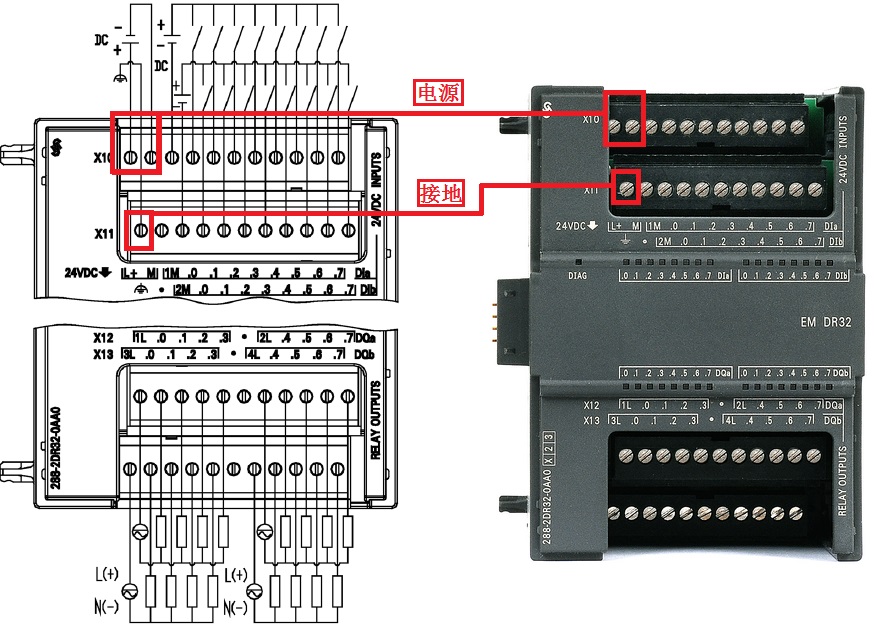 (1) 模块缺少24V直流供电电源; I/O扩展模块缺少24V直流供电电源时,所有通道指示灯也以红色闪烁。建议核对模块接线图,尤其是模块供电端含两排端子的,确定供电接线是否正确,以EM DR32为例,正确的接线方式如下图所示。