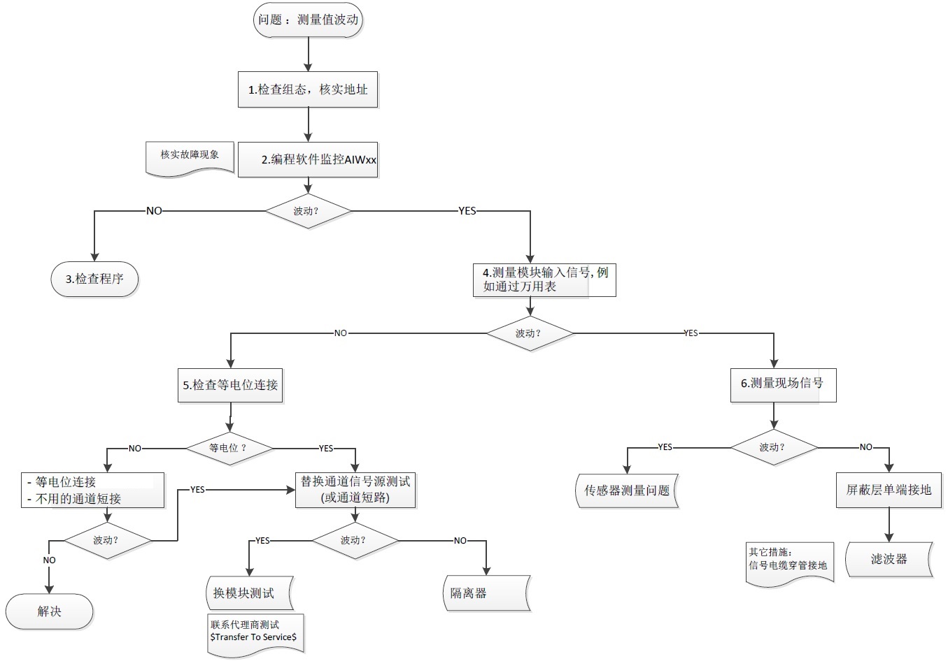 当 S7-200 SMART模拟量输入模块接收到测量值波动时,可通过如下图的步骤进行检查: